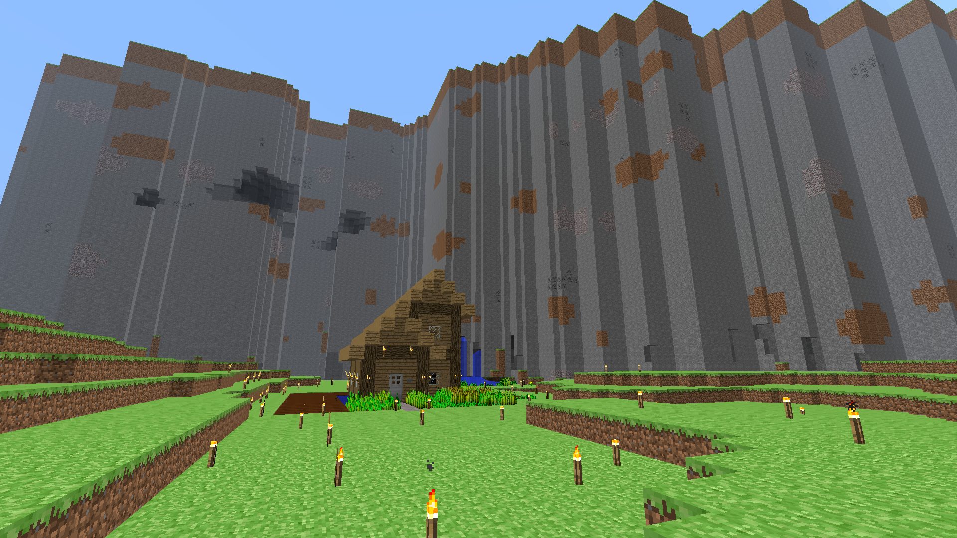 So, what I've done prior to today is: build a house, do some mining, and plant some seeds. Here's my starter house in the shadow of the monolith: