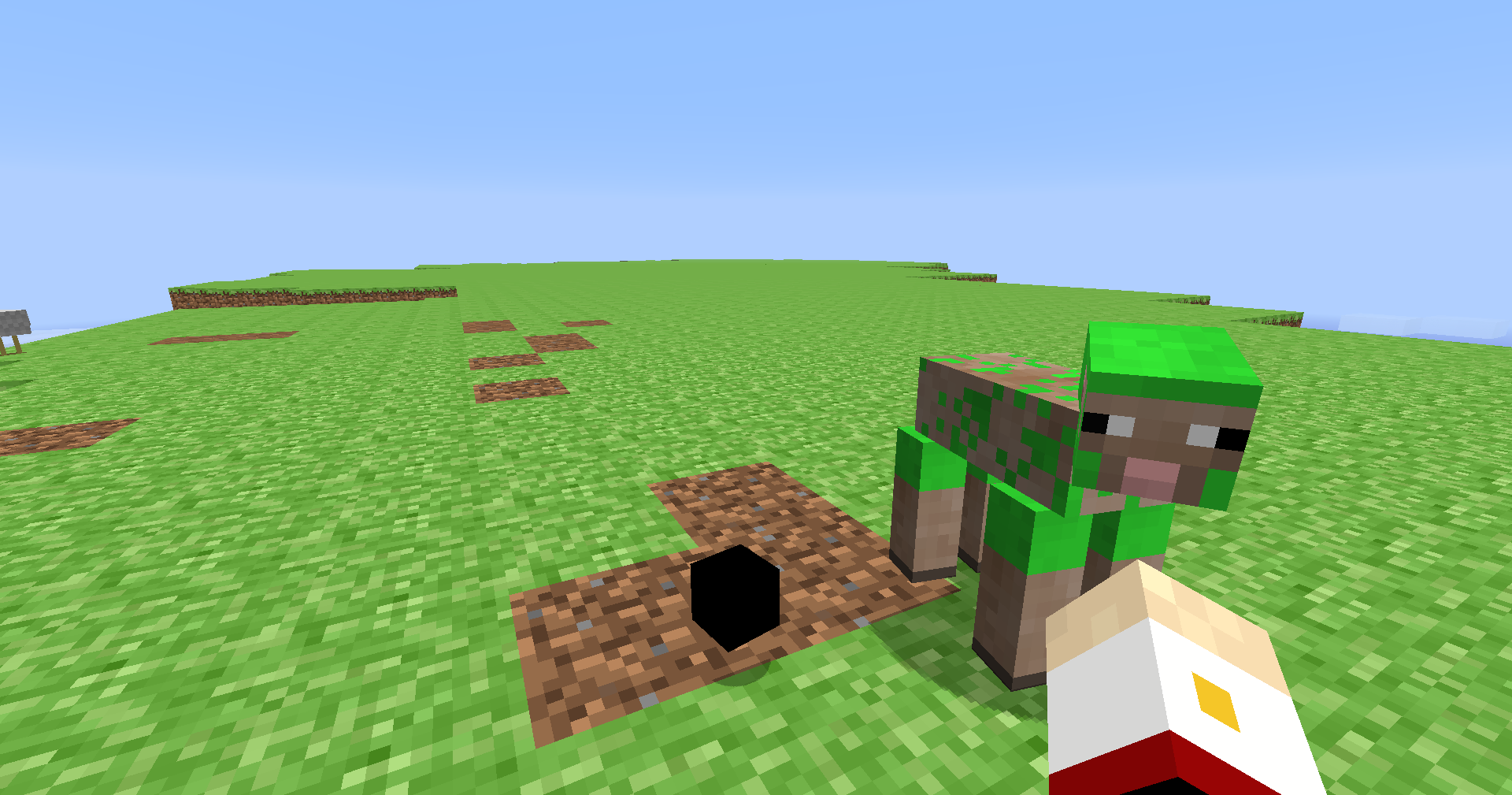 I like the approach taken here by Alpha-Env to add the coloured wool back: rather than filling the game with dyes, which would feel very un-Alpha, the dev has instead made some sheep spawn as coloured sheep. Fun! A majority of sheep spawns are normal white sheep, but I have seen two green sheep and a red one. They do regenerate their wool, and this green sheep has yet to despawn, so I think you might be able to farm them somewhat? Of course, with the punching-to-get-wool process, there are... casualties. So it could be risky business.
