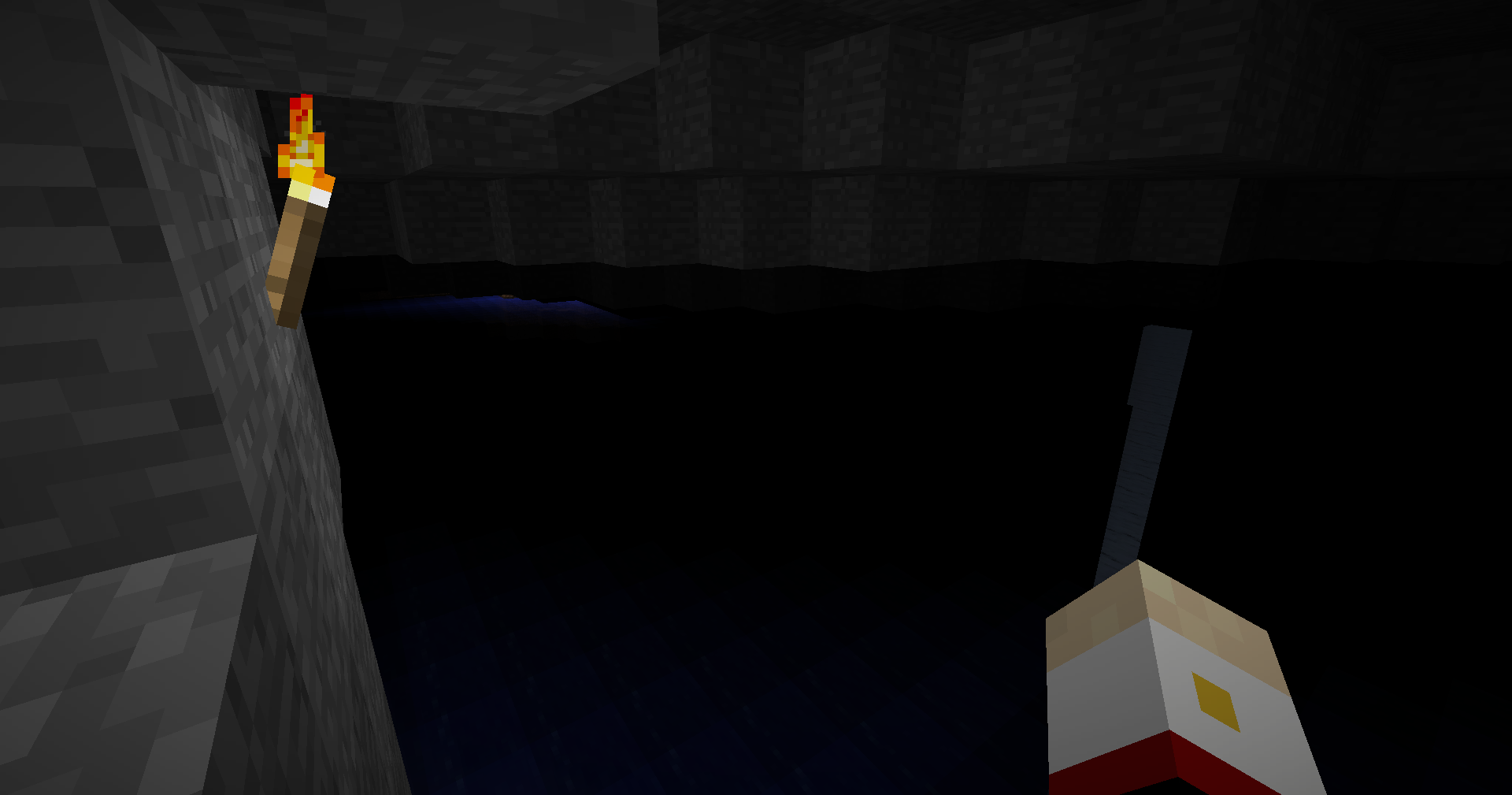 Rather than solid stone going all the way to bedrock, there is an eerie, empty void. Void is the right word, too, as the monolith error seems to prevent any bedrock generating. As you can see, my monolith has water filling the area beneath it, but I have seen images online of monoliths with empty holes going all the way down forever; bottomless pits where you're guaranteed death AND a loss of all your items if you fall. But I am fortunate (?) enough to have a bit of a safety net in the form of this subterranean lake. An eerie, inky, infinitely deep lake...